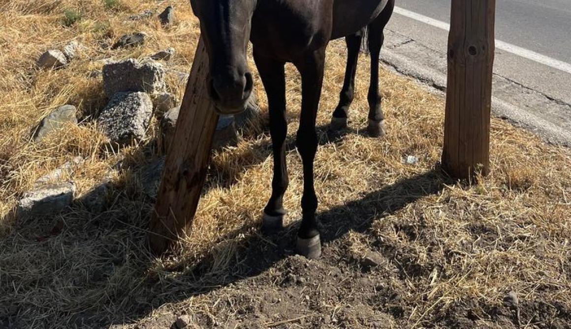 Αυτό το άλογο, θηλυκο, είναι από το πρωί δεμένο απέναντι από το γυμνάσιο θερμής. Δεν το έχω ξαναδεί. Το σχοινί είναι πολύ κοντό φαίνεται ότι κάποιος το έδεσε πρόχειρα. Δεν έχει νερό ούτε σκιά. Μπορούμε να κάνουμε μια κοινοποίηση, μήπως έχει χαθεί;