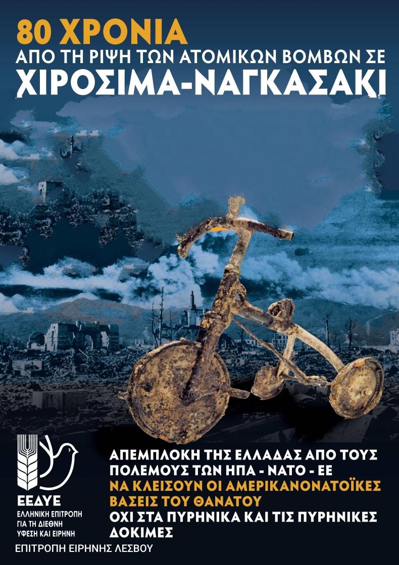 Με αφορμή τη συμπλήρωση 80 χρόνων από τα πυρηνικά ολοκαυτώματα της Χιροσίμα και του Ναγκασάκι, η Επιτροπή Ειρήνης Λέσβου διοργανώνει σειρά εξορμήσεων σε πόλεις και χωριά του νησιού, καλώντας τον λαό της Λέσβου να υψώσει φωνή αντίστασης στον πόλεμο, την εμπλοκή της χώρας σε ιμπεριαλιστικούς σχεδιασμούς και την απειλή πυρηνικής καταστροφής.