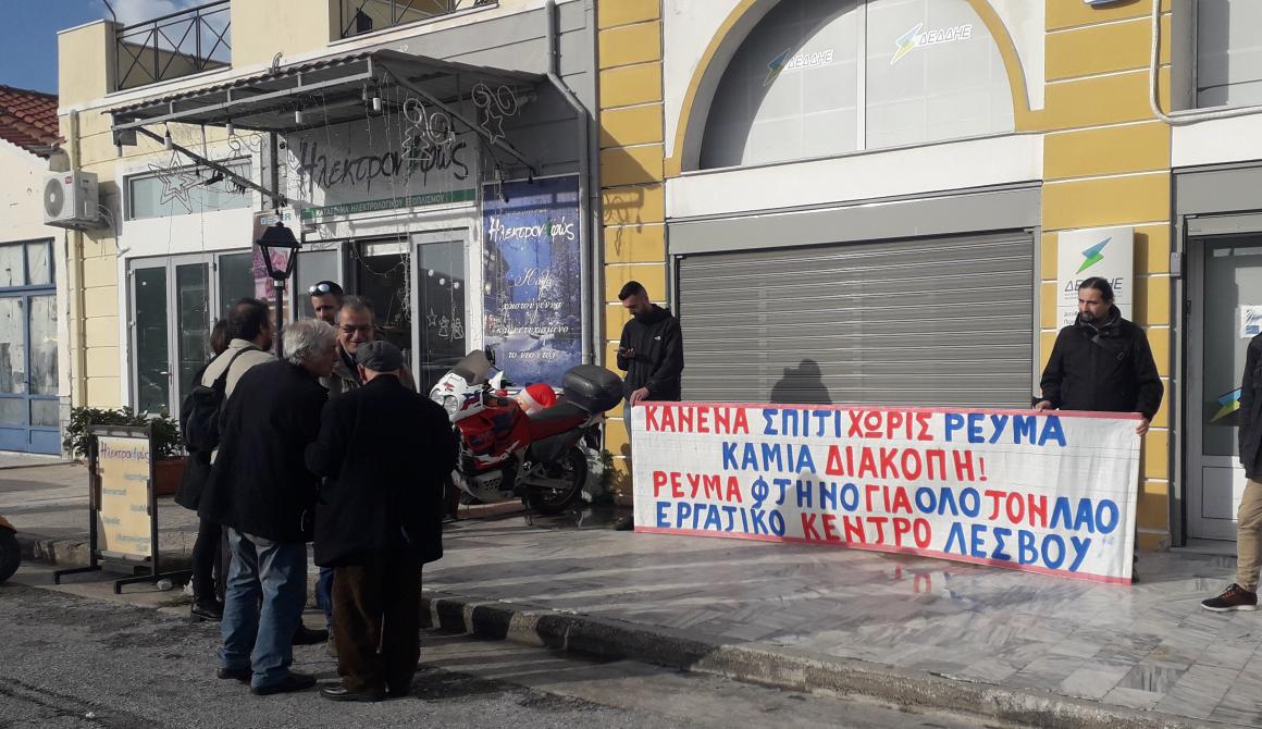 Δυναμική παρέμβαση πραγματοποίησαν χθες Τετάρτη 29/5, μέλη της Διοίκησης του Εργατικού Κέντρου και των Σωματείων μελών του στα γραφεία της ΔΕΗ, απαιτώντας την επανασύνδεση του ηλεκτρικού ρεύματος σε ηλικιωμένο ζευγάρι που κατοικεί στο Λισβόρι και προσπαθεί να ζήσει με ένα επίδομα 313 ευρώ το μήνα που λαμβάνει η γυναίκα λόγω αναπηρίας. Η διακοπή ρεύματος είχε γίνει εδώ και τρεις μήνες για ανεξόφλητους λογαριασμούς!!!