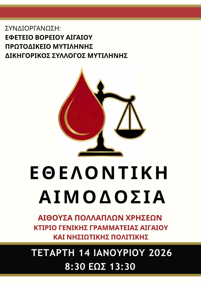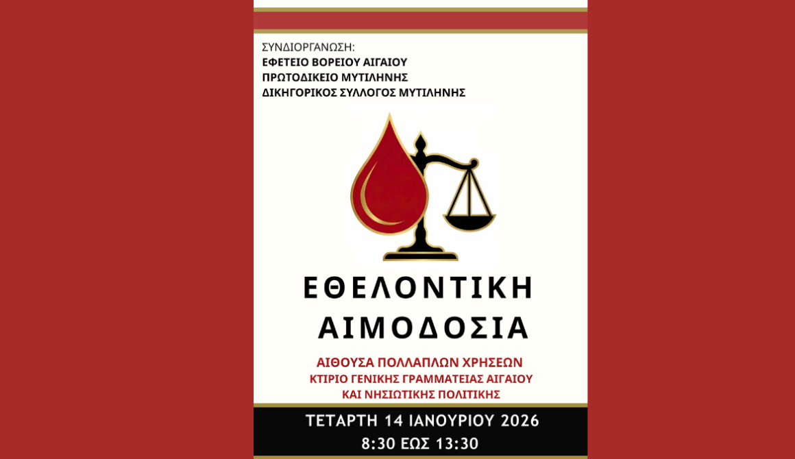 Ο Δικηγορικός Σύλλογος Μυτιλήνης σε συνεργασία με το Εφετείο Βορείου Αιγαίου και το Πρωτοδικείο Μυτιλήνης, συνδιοργανώνει εθελοντική αιμοδοσία την Τρίτη 14 Ιανουαρίου 2026 ώρες 08:30 – 13:30, στην αίθουσα πολλαπλών χρήσεων του κτιρίου της Γενικής Γραμματείας Αιγαίου και Νησιωτικής Πολιτικής.