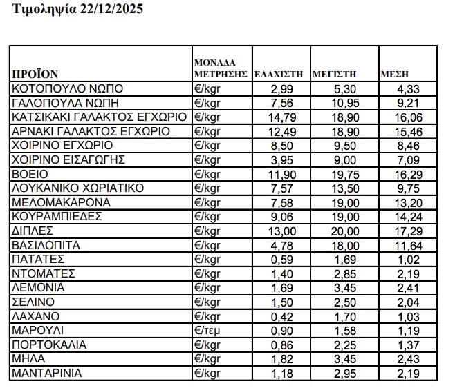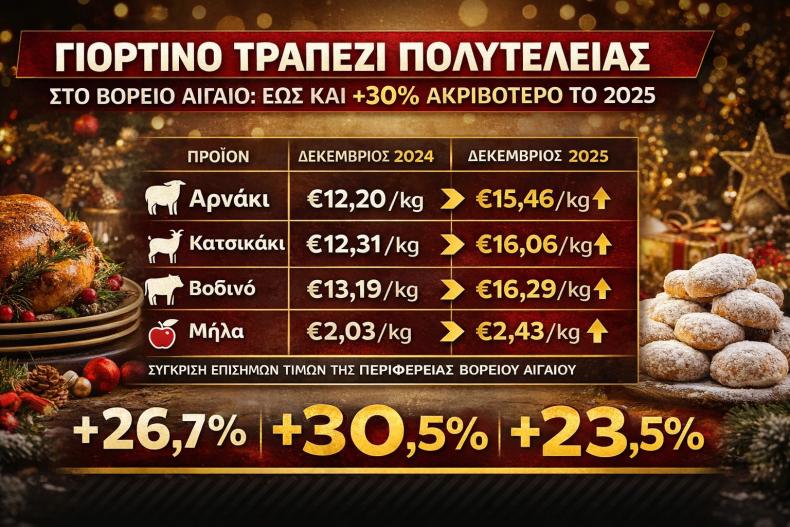 Οι τιμές που ανακοίνωσε η Περιφέρεια Βορείου Αιγαίου/ Τμήμα Εμπορίου για το γιορτινό τραπέζι του 2025 αποτυπώνουν μια πραγματικότητα που οι καταναλωτές ήδη νιώθουν στο πορτοφόλι τους: το τραπέζι των Χριστουγέννων κοστίζει ακριβότερα σχεδόν σε όλες τις βασικές κατηγορίες.