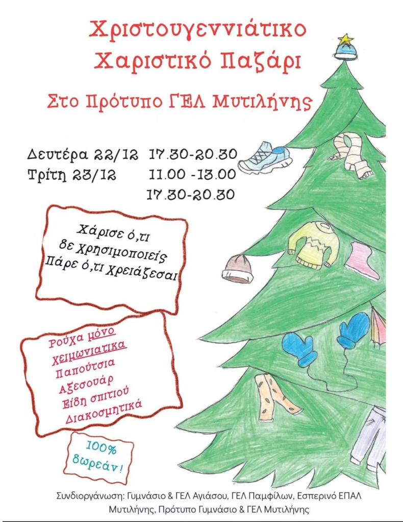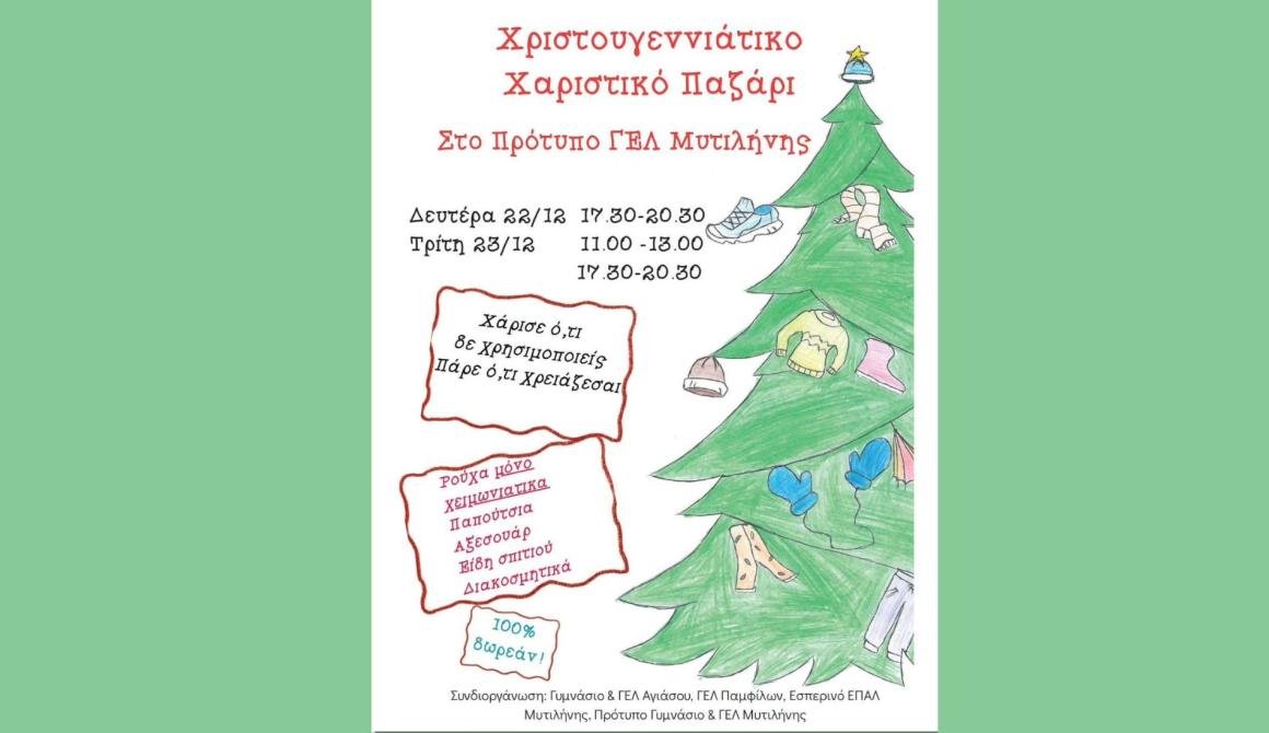 Το σχολικό συγκρότημα του Πρότυπου ΓΕΛ Μυτιλήνης μεταμορφώνεται αυτές τις ημέρες σε έναν μικρό θησαυρό κοινωνικής προσφοράς, φιλοξενώντας το Χριστουγεννιάτικο Χαριστικό Παζάρι, μια δράση που στηρίζεται στην πιο καθαρή έννοια της προσφοράς: «Χάρισε ό,τι δε χρησιμοποιείς — πάρε ό,τι χρειάζεσαι».