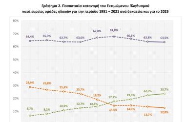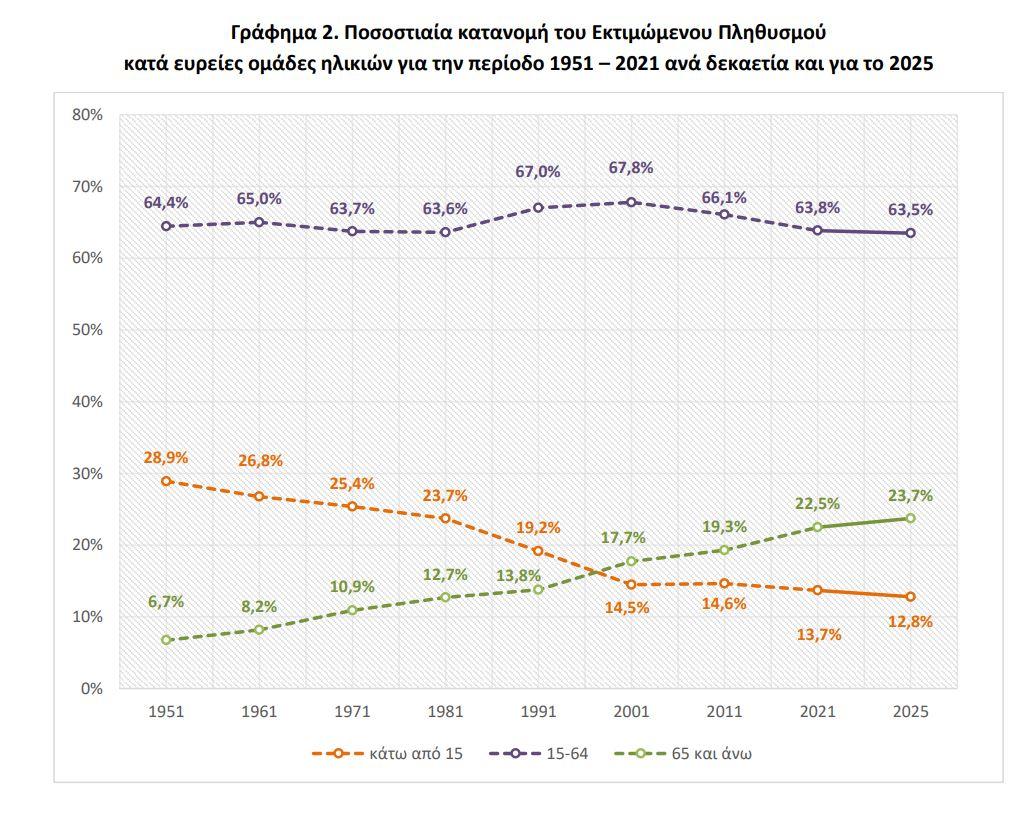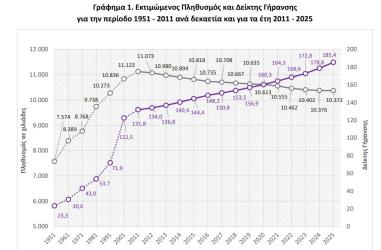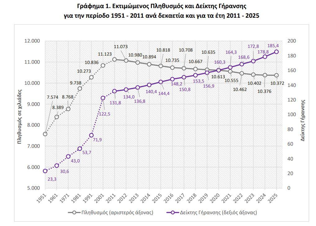 Ο δείκτης γήρανσης φθάνει το 185,4, δηλαδή αντιστοιχούν περίπου 185 άτομα άνω των 65 για κάθε 100 παιδιά. Πρόκειται για έναν δείκτη που μετατρέπει το δημογραφικό σε ζήτημα οικονομικής βιωσιμότητας και κοινωνικής αντοχής.