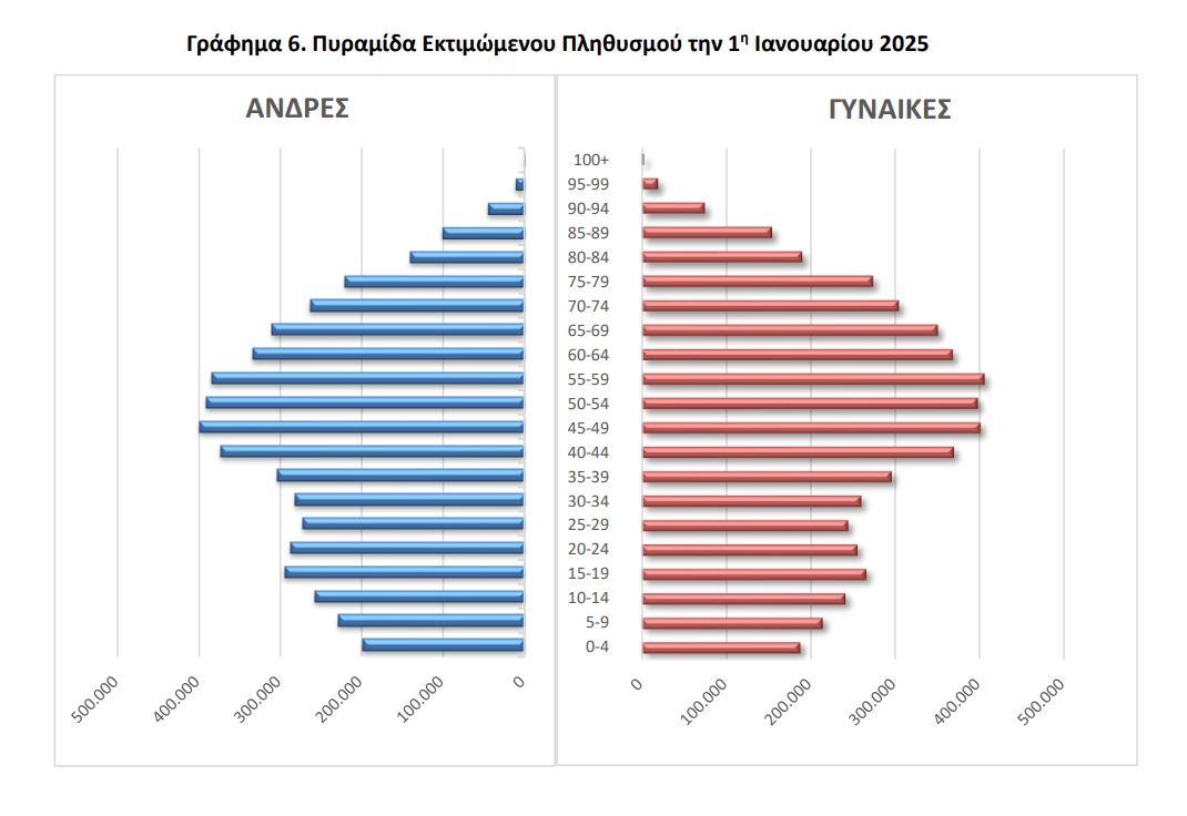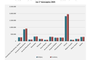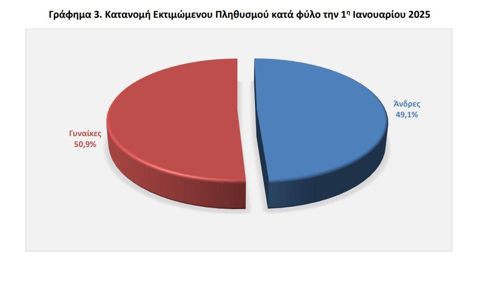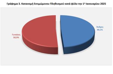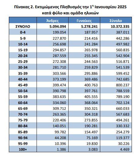 Μικρή αλλά ουσιαστική μείωση του μόνιμου πληθυσμού της Ελλάδας αποτυπώνεται στα νεότερα δημογραφικά δεδομένα. Την 1η Ιανουαρίου 2025, ο πληθυσμός της χώρας εκτιμάται σε 10.372.335 άτομα – 5.094.094 άνδρες και 5.278.241 γυναίκες – καταγράφοντας πτώση 0,03% σε σχέση με τον αναθεωρημένο πληθυσμό της 1ης Ιανουαρίου 2024, που ανερχόταν σε 10.375.764 κατοίκους.