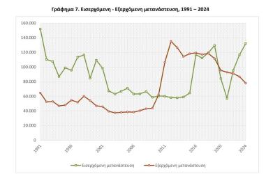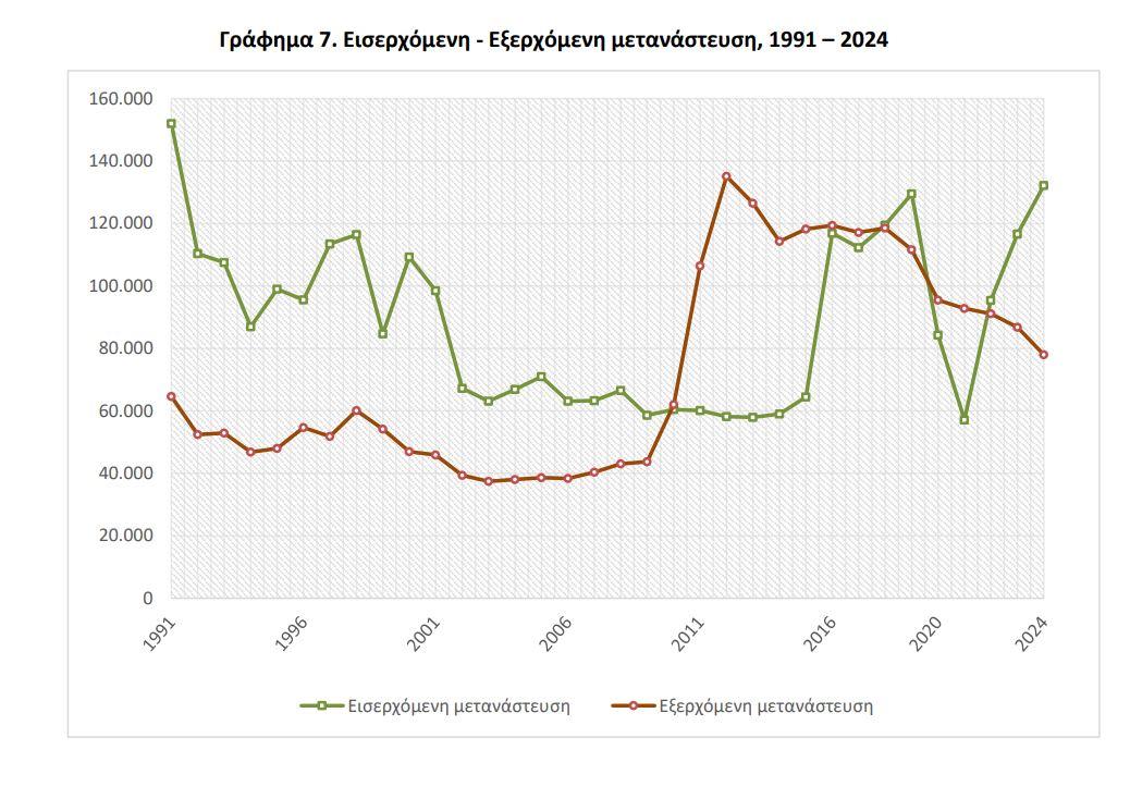 Την ίδια στιγμή, η καθαρή μετανάστευση το 2024 εκτιμάται σε +54.135 άτομα, παρουσιάζοντας σαφώς θετικό ισοζύγιο.