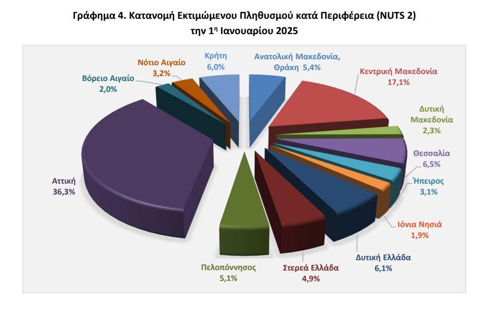 Η δημογραφική εικόνα δεν είναι ενιαία σε όλη τη χώρα. Μεγάλες περιφέρειες, όπως η Αττική και η Κεντρική Μακεδονία, συνεχίζουν να συγκεντρώνουν πληθυσμό και δραστηριότητες, λειτουργώντας ως “μαγνήτες”.