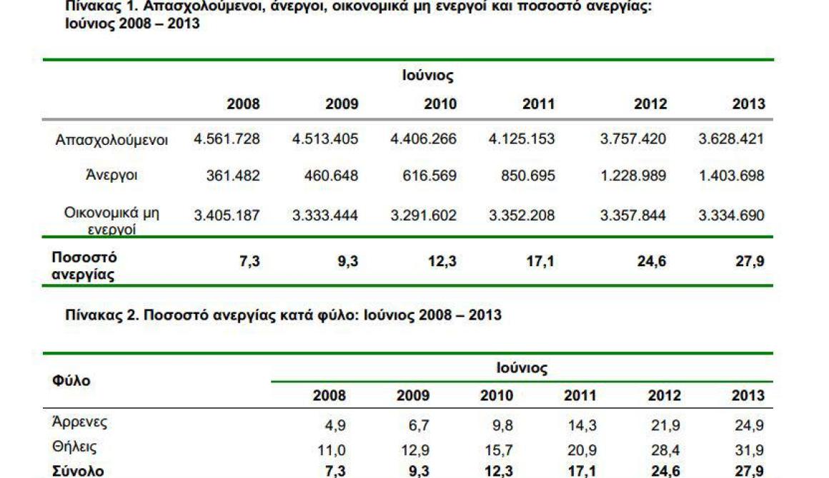 Υψηλότερο ποσοστό ανεργίας καταγράφεται επίσης στον γυναικείο πληθυσμό, όπου αυξήθηκε σε 31,9% από 28,4% τον Ιούνιο του 2012, ενώ στους άνδρες αυξήθηκε σε 24,9% από 21,9%.