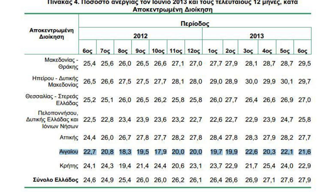 Για την Αποκεντρωμένη Διοίκηση Αιγαίου το ποσοστό ανεργίας για τον Ιούνιο 2013 είναι 21,6% έναντι 22,7% τον Ιούνιο του 2012.