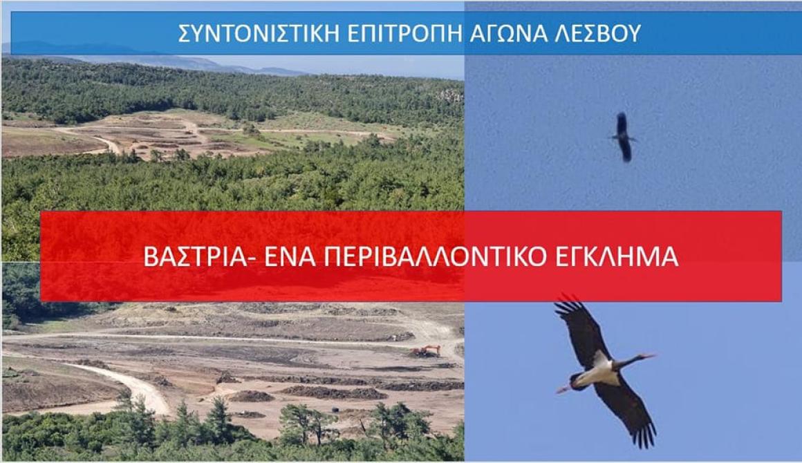 -Γιατί έχουν καταπατήσει και τροποποιήσει όλη την περιβαλλοντική νομοθεσία για να κατασκευάσουν την δεύτερη μεγαλύτερη πόλη της Λέσβου μέσα σε αυστηρά προστατευόμενη περιοχή που αποτελεί καταφύγιο άγριας ζωής και περιοχή Natura όπου φωλιάζουν σπάνια για την Ευρώπη είδη της ορνιθοπανίδας (όπως ο, εγγεγραμμένος στο κόκκινο βιβλίο των απειλούμενων ειδών της Ελληνικής πανίδας, ιδιαίτερα σπάνιος μαυροπελαργός της φωτογραφίας που φωλιάζει στην Βάστρια και τον εντοπίσαμε εχθές) .