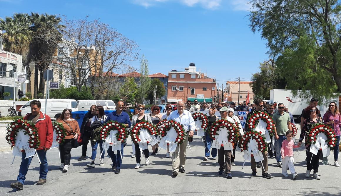 Στη συνέχεια ακολούθησε πορεία από την προκυμαία προς το Άγαλμα της Εθνικής Αντίστασης στον Μακρύ Γιαλό, όπου έγινε κατάθεση στεφάνων από πλήθος σωματείων.