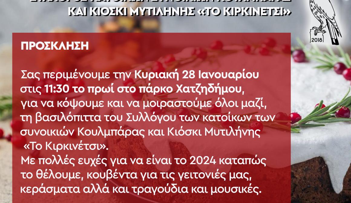Ο Σύλλογος κατοίκων Κουλμπάρας και Κιόσκι Μυτιλήνης «το κιρκινέτσι», κόβει και μοιράζεται με όλους τη βασιλόπιτα του. Tην Κυριακή 28 Ιανουαρίου στις 11,30 το πρωί στο ξεχασμένο και ρημαγμένο πάρκο Χατζηδήμου.