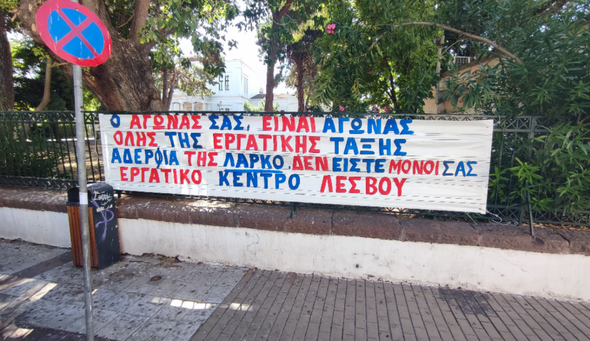«ο αγώνας σας, είναι αγώνας όλης της Εργατικής Τάξης. Αδέρφια της ΛΑΡΚΟ δεν είστε μόνοι σας» γράφουν τα πανό που αναρτήθηκαν από την Διοίκηση του Εργατικού Κέντρου Λέσβου στην πόλη της Μυτιλήνης, σήμερα Τετάρτη 17 Ιούλη.
