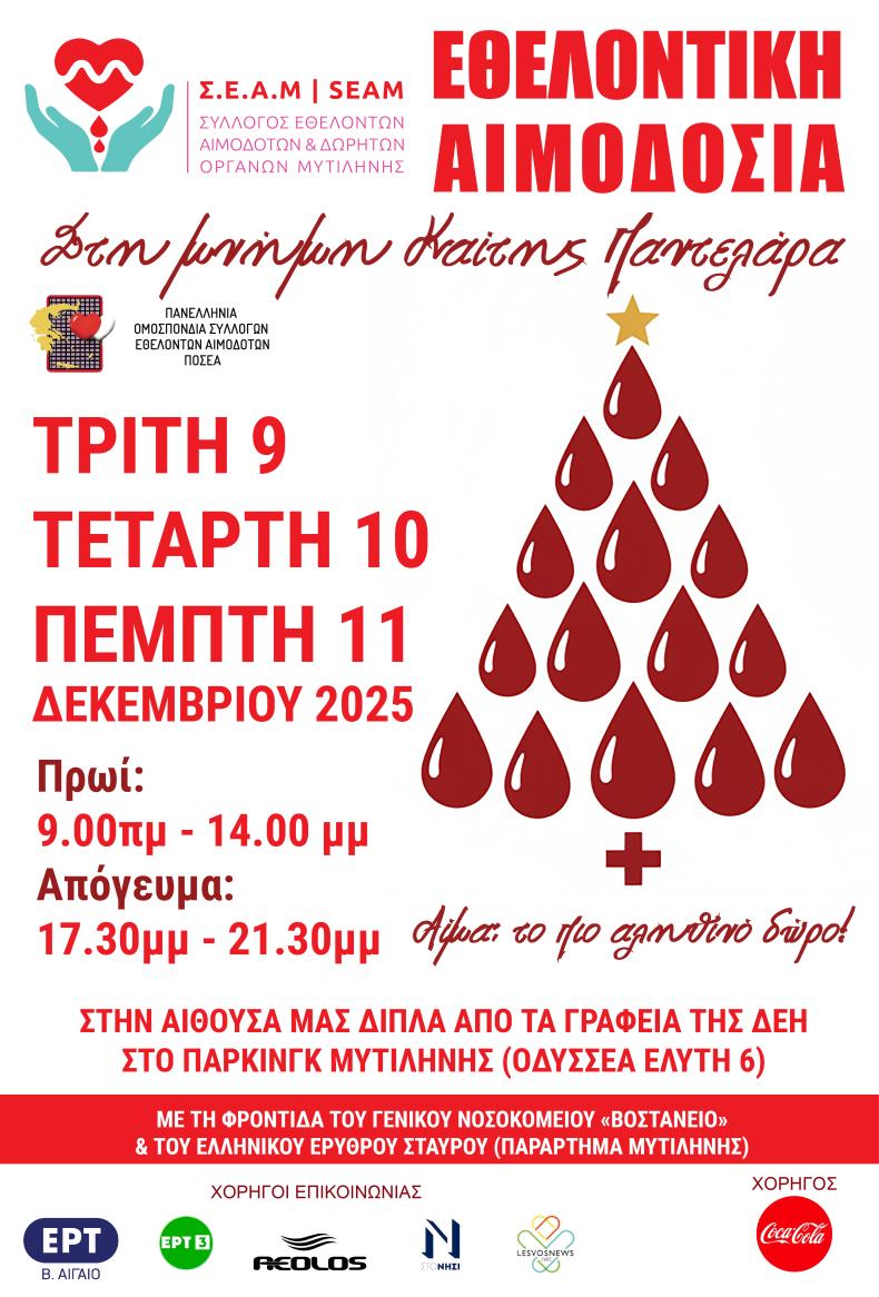 Ο κύκλος της αλληλεγγύης στη Μυτιλήνη δεν σταματά ποτέ. Ο Σύλλογος Εθελοντών Αιμοδοτών & Δωρητών Οργάνων Σώματος Μυτιλήνης επιστρέφει με μια τριήμερη αιμοδοσία που λειτουργεί σαν πυξίδα ανθρωπιάς: απλή πράξη, τεράστιο αντίκτυπο.