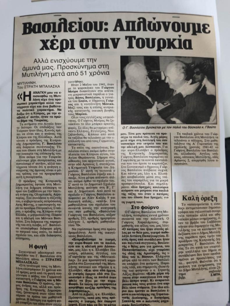Χρόνια μετά, το Μάιο του 1992 – πριν 34 πάει να πει χρόνια! - Πρόεδρος της Κυπριακής Δημοκρατίας πια επί Δημαρχίας Μυτιλήνης Νότη Παναγιώτου, ο Γιώργος Βασιλείου επέλεξε να επισκεφθεί «τον τόπο της εξορίας του».
