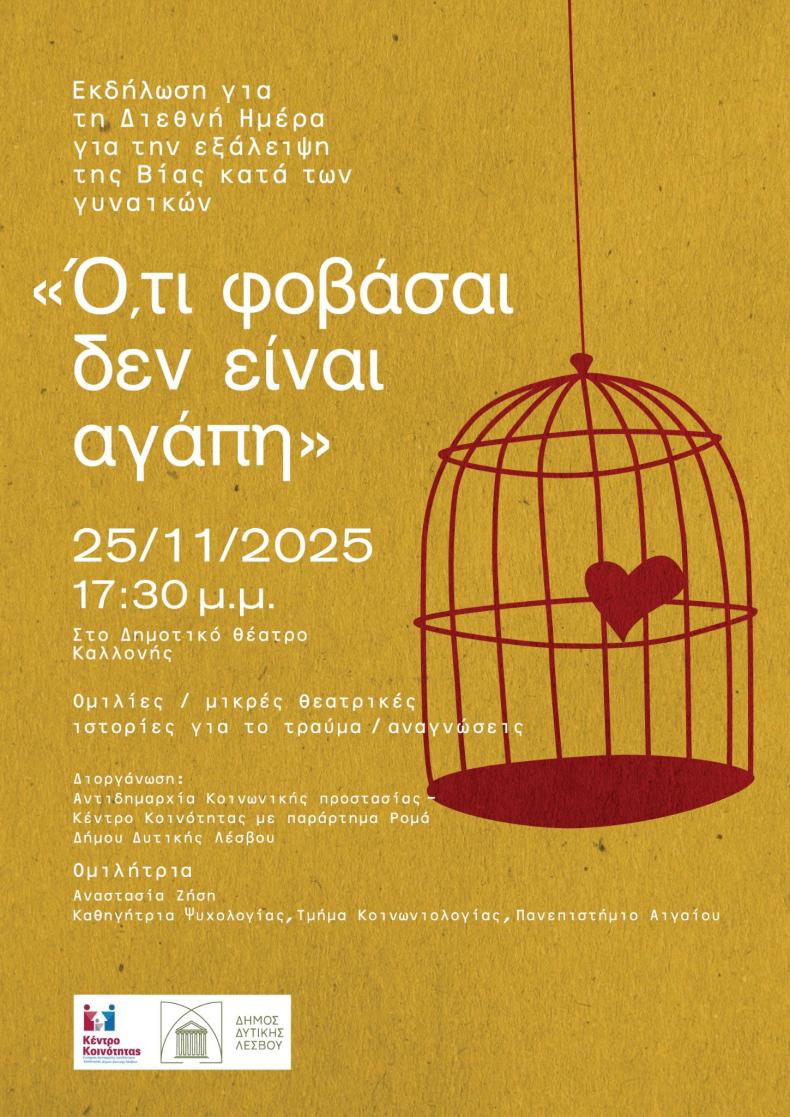 H Αντιδημαρχία Κοινωνικής Προστασίας και το Κέντρο Κοινότητας με Παράρτημα Ρομά του Δήμου Δυτικής Λέσβου, σας προσκαλεί σε εκδήλωση με αφορμή τη Διεθνή Ημέρα Εξάλειψης της Βίας κατά των Γυναικών.
