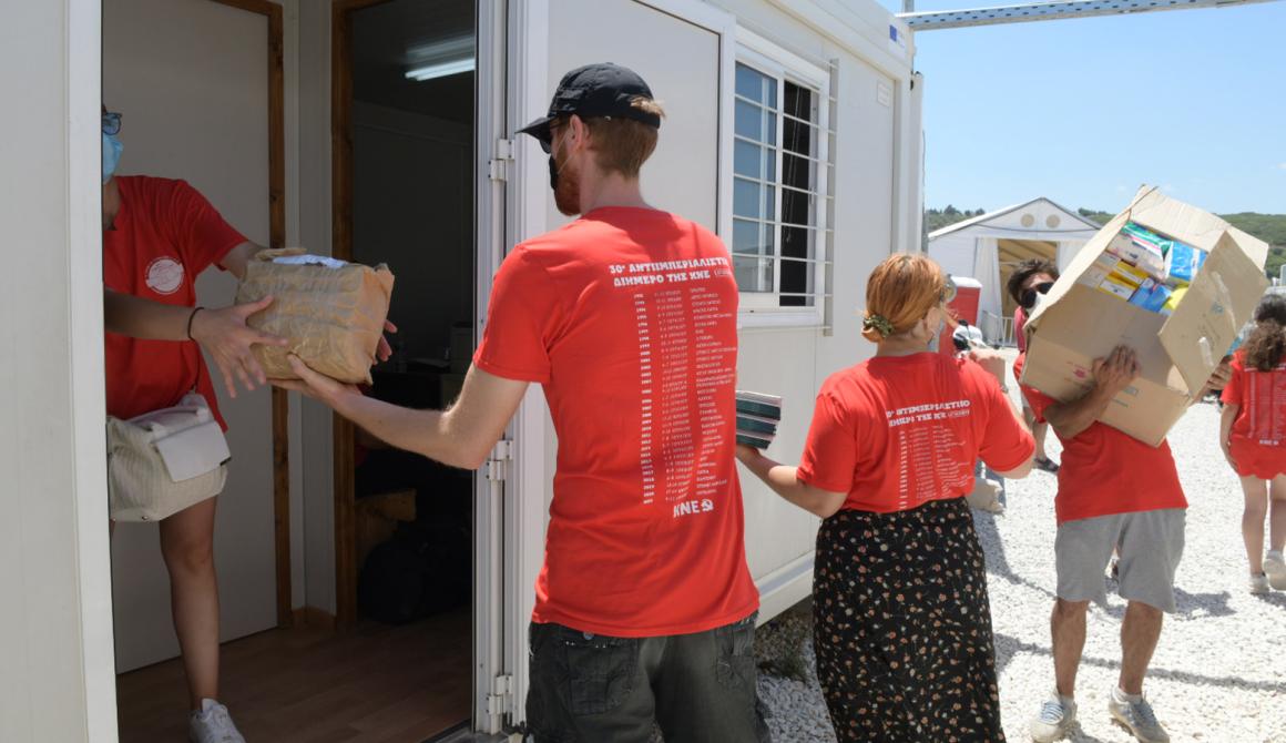Τα μέλη της ΚΝΕ έδωσαν παιχνίδια, παιδικά βιβλία και παραμύθια στις γλώσσες τους, σχολικά είδη, είδη βρεφικής φροντίδας και είδη ατομικής υγιεινής που συγκεντρώθηκαν μετά το κάλεσμα της ΚΝΕ τις τελευταίες εβδομάδες.