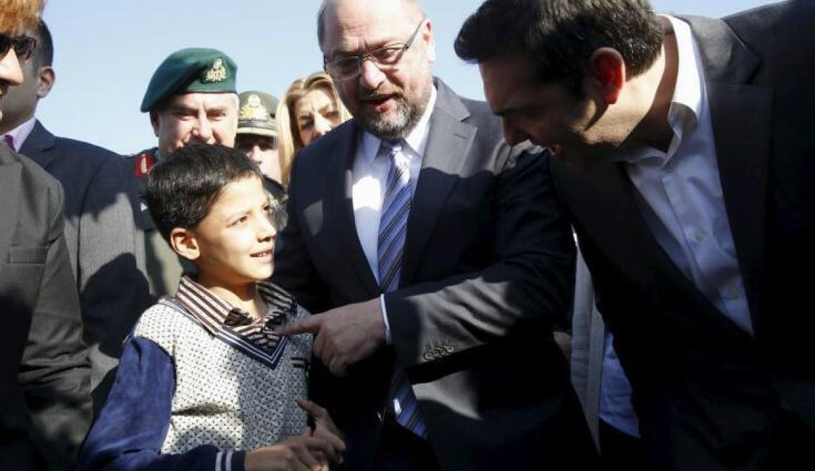 Πίσω από τις κάμερες, κατά την επίσκεψη του προέδρου του Ευρωκοινοβουλίου Μάρτιν Σουλτς και του πρωθυπουργού Αλέξη Τσίπρα στο hot spot, το Κέντρο Πρώτης Υποδοχής Μεταναστών της Λέσβου, εκτυλίχθηκε το ακόλουθο στιγμιότυπο με πρωταγωνιστή ένα προσφυγόπουλο.