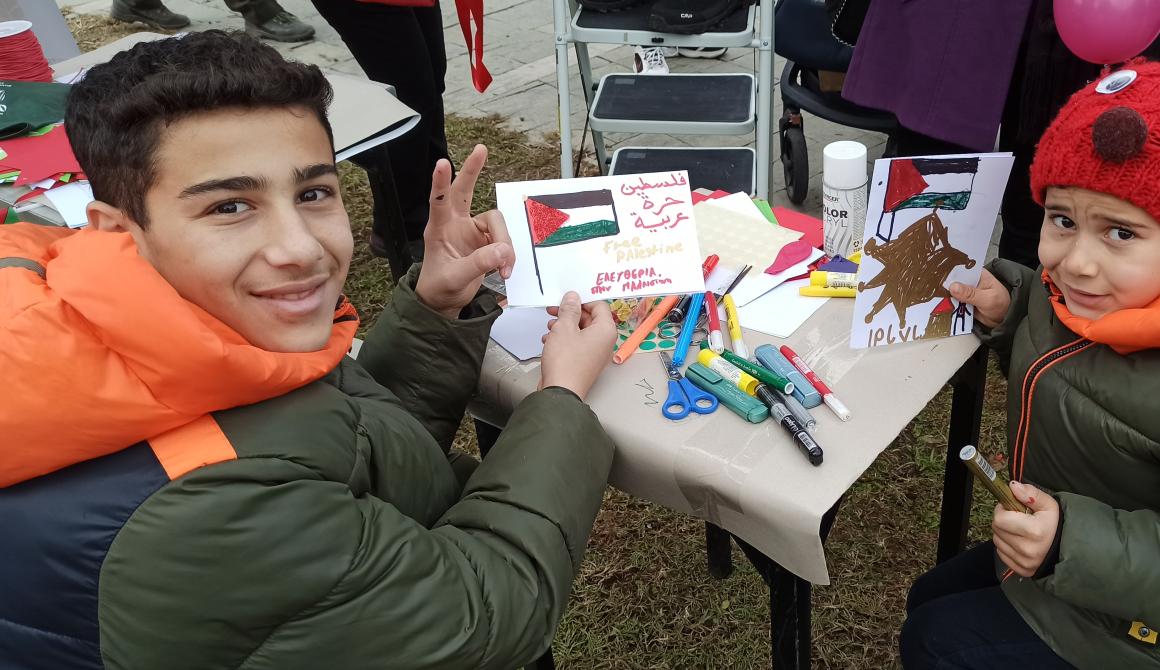 Πολύχρωμες Ζωγραφιές με το περιστέρι της ειρήνης, με αστεράκια που μέσα έγραφαν «όχι στον πόλεμο. Θέλουμε ειρήνη», με τη σημαία της Παλαιστίνης και την απαίτησή τους να σταματήσουν να σκοτώνουν καθημερινά το λαό της, με μπαλόνια που πάνω έγραψε μια μαμά «Οι μαμάδες λέμε ΟΧΙ στον πόλεμο».