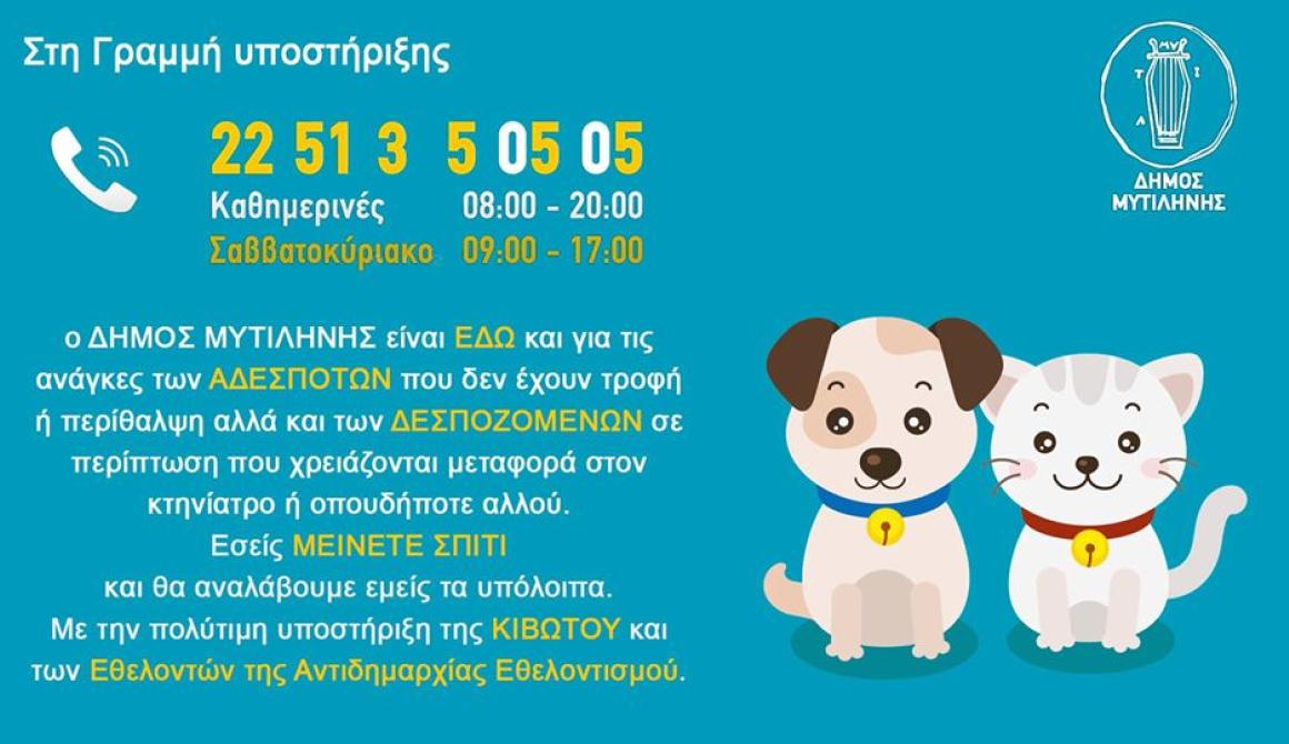 Οι δημότες του Δήμου Μυτιλήνης μπορούν να ΜΕΙΝΟΥΝ ΣΤΟ ΣΠΙΤΙ και εμείς θα αναλάβουμε τις υποχρεώσεις των μικρών μας φίλων.