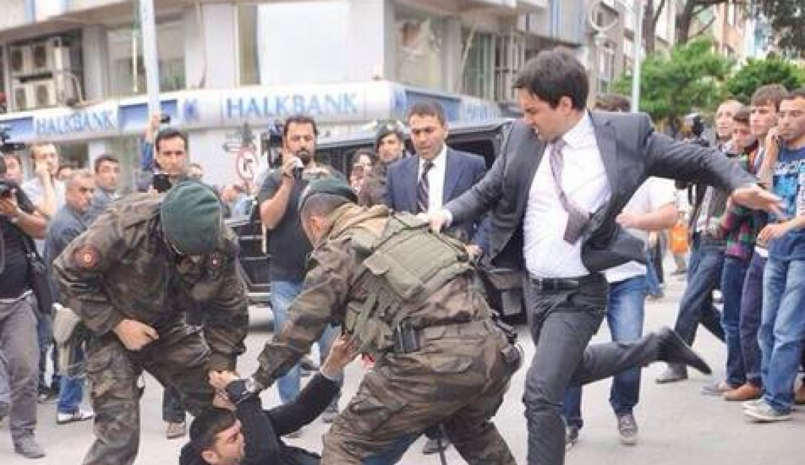 Ο Γιουσούφ Γερκέλ, ένας από τους συμβούλους του Ερντογάν, απαθανατίστηκε να δίνει μία κλωτσιά σε διαδηλωτή, τον οποιο κρατούν δύο στρατιώτες. Σύμφωνα με αυτόπτες μάρτυρες, ειδκές δυνάμεις ανέκριναν τον διαδηλωτή μετά την κλωτσιά που έδωσε εκείνος σε αυτοκίνητο της πομπής του τούρκου πρωθυπουργού. Ο Γερκέλ, ο οποίος είδε τη σκηνή την ώρα που ετοιμαζόταν να μπει σε στο αυτοκίνητο, έτρεξε προς τον διαδηλωτή και τον κλώτσησε τρεις - τέσσερις φορές.
