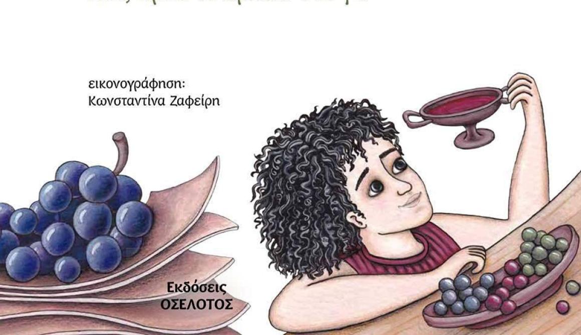 Οι μύθοι γύρω από τον θεό Διόνυσο και τη σύνδεσή του με την καλλιέργεια του αμπελιού, λοιπόν, είναι το θέμα του βιβλίου αυτού. Για τον Διόνυσο που είναι, θα λέγαμε, από τους κάπως παραγνωρισμένους θεούς του Ολύμπου – ενώ για τον Δία, για την Αθηνά, για τον Ποσειδώνα, για την Αφροδίτη και άλλους-ες, έχουμε μια νοερή απεικόνιση του πώς αποδιδόταν η μορφή τους σε αγάλματα και αγγεία, η οποία αναπαράγεται στις σύγχρονες εικονογραφήσεις, για τον Διόνυσο δεν ενεργοποιείται εξίσου εύκολα αντίστοιχος συνειρμός. Κι είναι ωραία η απεικόνισή του στο βιβλίο αυτό από την Κωνσταντίνα Ζαφείρη– ένας σγουρομάλλης νέος, που τα μαλλιά του παραπέμπουν σε σκουρόχρωμα τσαμπιά σταφύλι. Πέρα από την ιστορία της γέννησής του από τη Σεμέλη και τον Δία, στο βιβλίο παρουσιάζεται και η πιο διαδεδομένη μυθολογική εκδοχή για τη γένεση του οίνου, που πήρε το όνομά του από τον βασιλιά Οινέα της Καλυδώνας, στα μέρη της Αιτωλίας, στο παλάτι του οποίου ο Διόνυσος γεύτηκε πρώτη φορά τον οίνο και διάλεξε την αποστολή του στη γη: τη διάδοση της καλλιέργειας του αμπελιού και της παραγωγής του ποτού αυτού, που θα ευφραίνει την καρδιά των ανθρώπων.