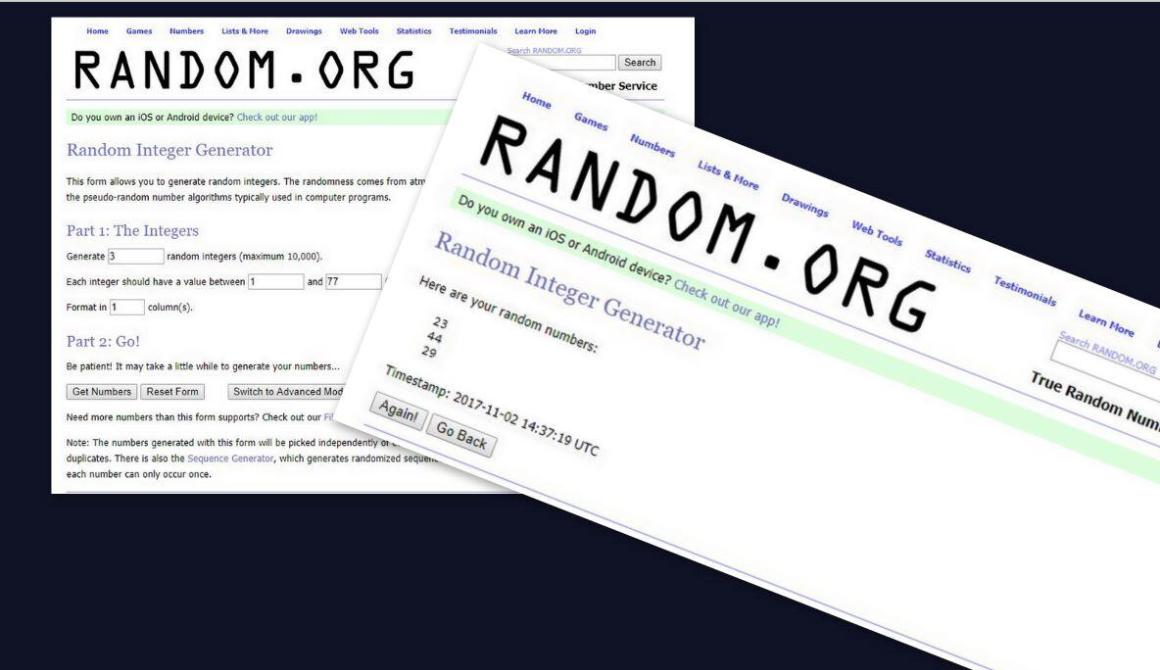 Η κλήρωση έγινε με τη βοήθεια της ιστοσελίδας random ( ζητήσαμε 3 τυχαίους αριθμούς από 1- 77). Επιλέγησαν οι αριθμοί 23-29-44