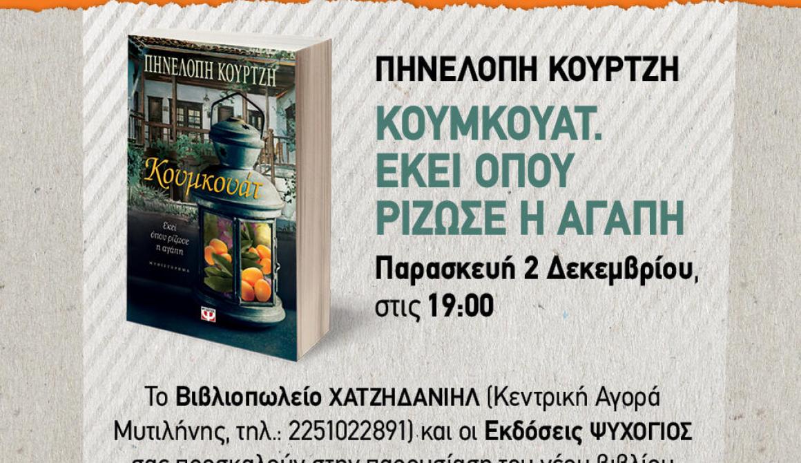 «Κουμκουάτ – Εκεί όπου ρίζωσε η αγάπη» της Πηνελόπης Κουρτζή, με την ευκαιρία της επίσκεψης της συγγραφέως στη Μυτιλήνη για την παρουσίασή του.