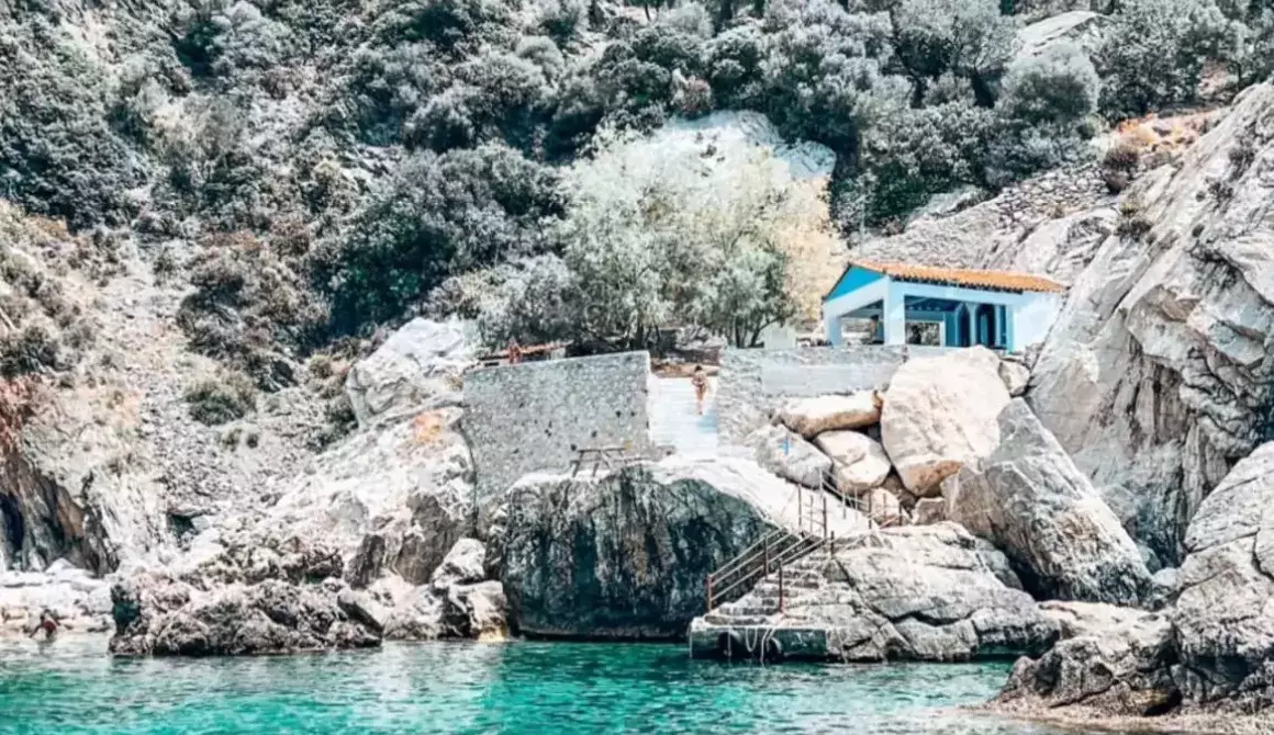 Στη φωτογραφία που δημοσίευσε η Ευρυδίκη Βαλαβάνη ποζάρει σε μια από τις πιο όμορφες τοποθεσίες του νησιού.