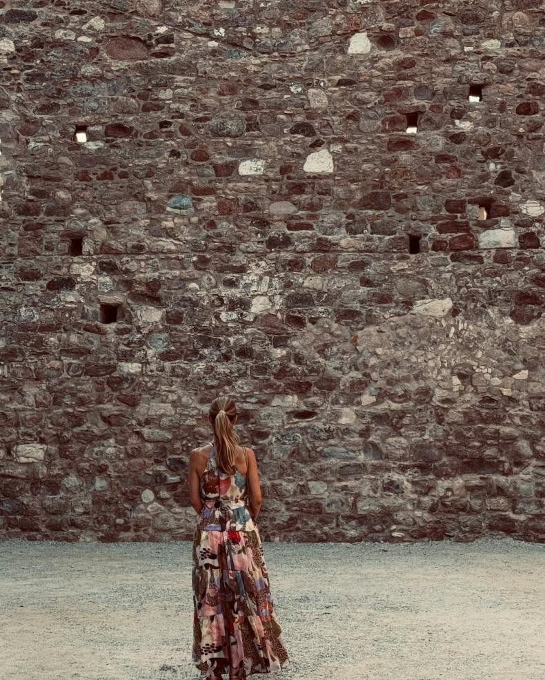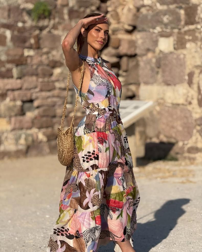 Η ηθοποιός και παρουσιάστρια, σε μια από τις πιο εντυπωσιακές εμφανίσεις του φετινού καλοκαιριού, επέλεξε ένα αέρινο εμπριμέ φόρεμα, σχεδιασμένο από τη φίλη της και γνωστή παρουσιάστρια Μαίρη Συνατσάκη. Το maxi φόρεμα, με κόστος 250 ευρώ, έκλεψε τις εντυπώσεις με το καλοκαιρινό του print και την ανάλαφρη γραμμή του, με φόντο το ιστορικό τοπίο της Μυτιλήνης. Η ίδια, ανεβάζοντας φωτογραφίες στο Instagram, απέσπασε δεκάδες σχόλια και likes για το εκλεπτυσμένο στιλ και την κομψότητά της, γράφοντας λιτά στη λεζάντα «Στο Κάστρο».