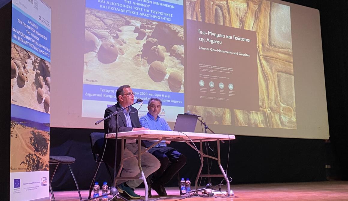 Με μεγάλη επιτυχία και με μεγάλη συμμετοχή της τοπικής κοινωνίας της Λήμνου πραγματοποιήθηκε η εκδήλωση με θέμα ‘’Ανάδειξη των γεωλογικών μνημείων της Λήμνου και αξιοποίησή τους για τουριστικές και εκπαιδευτικές δραστηριότητες’’ που πραγματοποιήθηκε στη Μύρινα την Τετάρτη 22 Νοεμβρίου 2023 για την παρουσίαση των αποτελεσμάτων της Πράξης «Δημιουργία – λειτουργία ψηφιακών εφαρμογών προβολής των γεω-μνημείων Λήμνου».