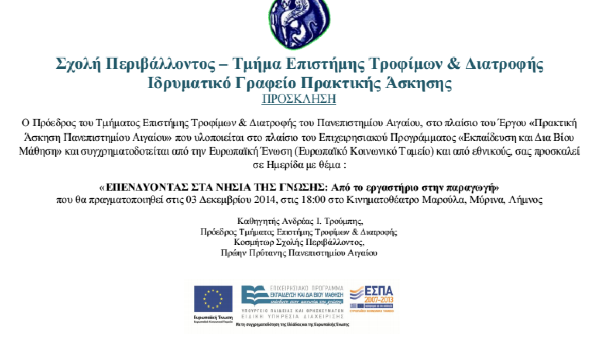 Ο Πρόεδρος του Τμήματος Επιστήμης Τροφίμων & Διατροφής του Πανεπιστημίου Αιγαίου, στο πλαίσιο του Έργου «Πρακτική Άσκηση Πανεπιστημίου Αιγαίου» που υλοποιείται στο πλαίσιο του Επιχειρησιακού Προγράμματος «Εκπαίδευση και Δια ΒίουΜάθηση» και συγχρηματοδοτείται από την Ευρωπαϊκή Ένωση (Ευρωπαϊκό Κοινωνικό Ταμείο) και από εθνικούς, σας προσκαλεί σε Ημερίδα με θέμα :