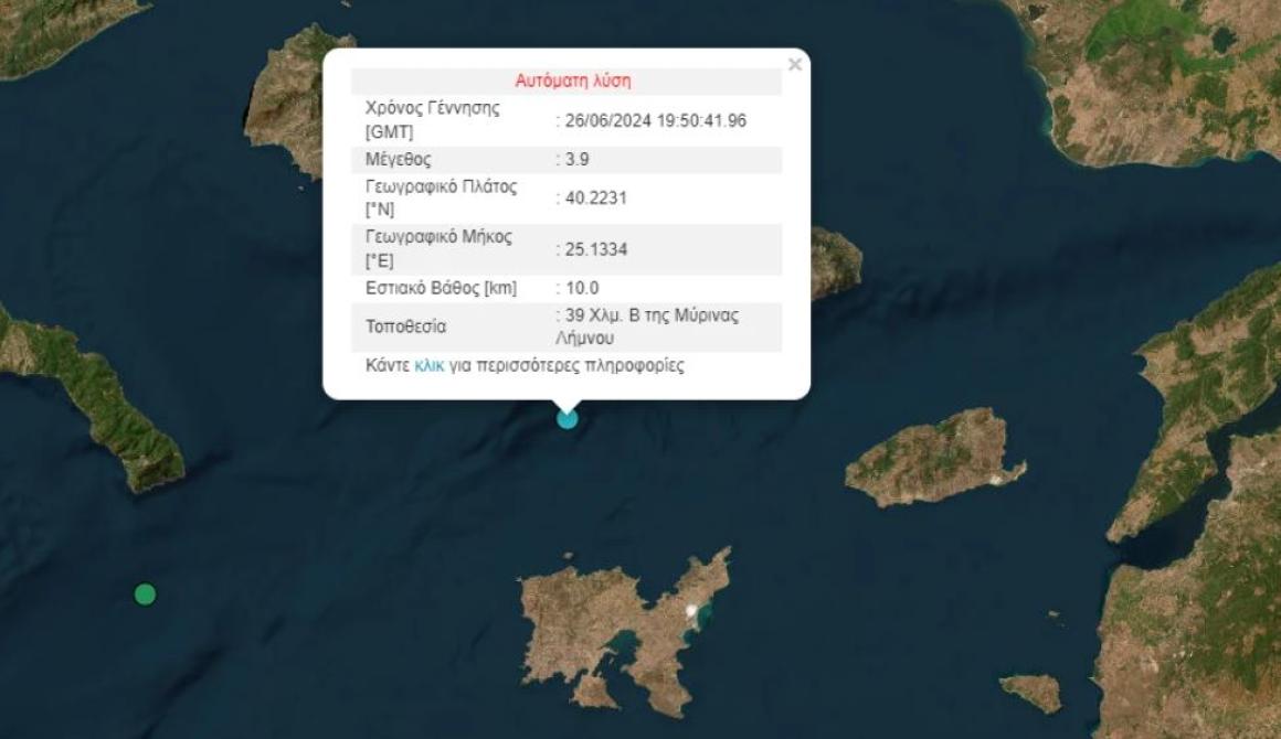 Σεισμός 3,9 Ρίχτερ σημειώθηκε λίγα λεπτά πριν τις 11 το βράδυ σε θαλάσσια περιοχή, ανάμεσα σε Σαμοθράκη και Λήμνο.