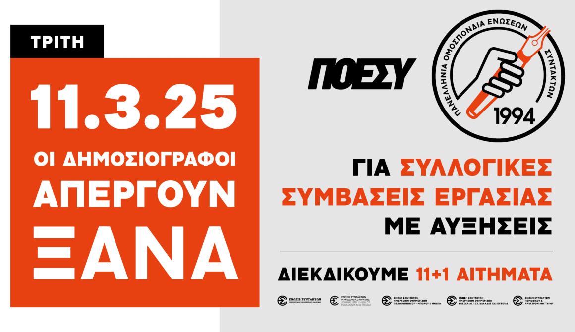 Τα Διοικητικά Συμβούλια της Πανελλήνιας Ομοσπονδίας Συντακτών (ΠΟΕΣΥ) και των δημοσιογραφικών Ενώσεων - μελών της (ΕΣΗΕΑ, ΕΣΗΕΜΘ, ΕΣΗΕΠΗΝ, ΕΣΗΕΘΣτΕΕ και ΕΣΠΗΤ) συναποφάσισαν την πραγματοποίηση νέας εικοσιτετράωρης απεργίας για όλους τους δημοσιογράφους, σε όλα τα ΜΜΕ της χώρας, από τις 5 το πρωί της Τρίτης, 11 Μαρτίου μέχρι τις 5 το πρωί της Τετάρτης, 12 Μαρτίου 2025.
