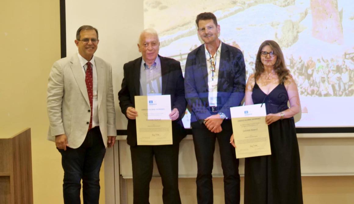 Κατά τη διάρκεια της τελετής έναρξης ο Διευθυντής του Προγράμματος Παγκόσμια Γεωπάρκα UNESCO Kristof Vandenberghe παρέδωσε στον Περιφερειάρχη Βορείου Αιγαίου Κωνσταντίνο Μουτζούρη το πιστοποιητικό επιτυχούς επαναξιολόγησης της Λέσβου ως Παγκόσμιο Γεωπάρκο UNESCO για την περίοδο 2025-2029.