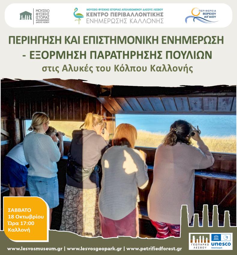 Τα στελέχη του Μουσείου Φυσικής Ιστορίας Απολιθωμένου Δάσους Λέσβου και του Κέντρου Περιβαλλοντικής Ενημέρωσης Καλλονής σας περιμένουν για την εκδήλωση ορνιθοπαρατήρησης που θα γίνει το Σάββατο 18 Οκτωβρίου 2025 στις 17.00 στο Παρατηρητήριο Πουλιών Νο 3 στις Αλυκές!