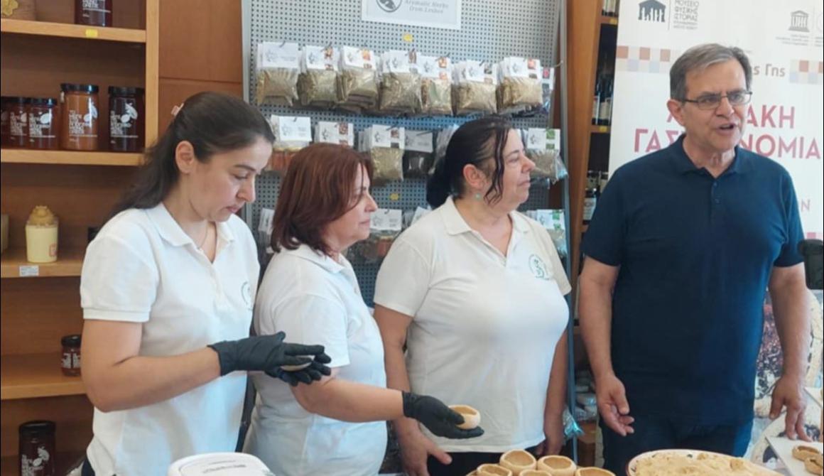 Οι επισκέπτες είχαν την ευκαιρία να δοκιμάσουν παραδοσιακές χάχλες, φτιαγμένες με λεσβιακά τυριά και ντομάτα, ένα γνήσιο δείγμα της πλούσιας και αυθεντικής τοπικής γαστρονομίας. Την παρουσίαση και παρασκευή των εδεσμάτων ανέλαβε με μεράκι ο Αγροτουριστικός Συνεταιρισμός Γυναικών Μεσοτόπου, ο οποίος εντυπωσίασε με την ποιότητα, τη γεύση και την παραδοσιακή τέχνη.