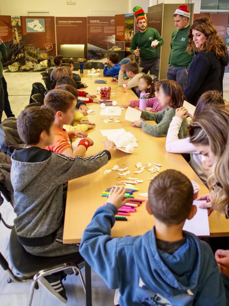 Στη συνέχεια, με μεγάλο ενθουσιασμό, φαντασία, χρώματα και πολλή δημιουργικότητα ζωγράφισαν χριστουγεννιάτικα στολίδια από πηλό εμπνευσμένα από τα φυτά και τα ζώα του Απολιθωμένου Δάσους Λέσβου ενώ παράλληλα έγραψαν τις δικές τους ευχές για τις γιορτές.