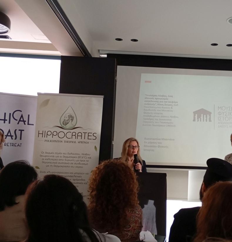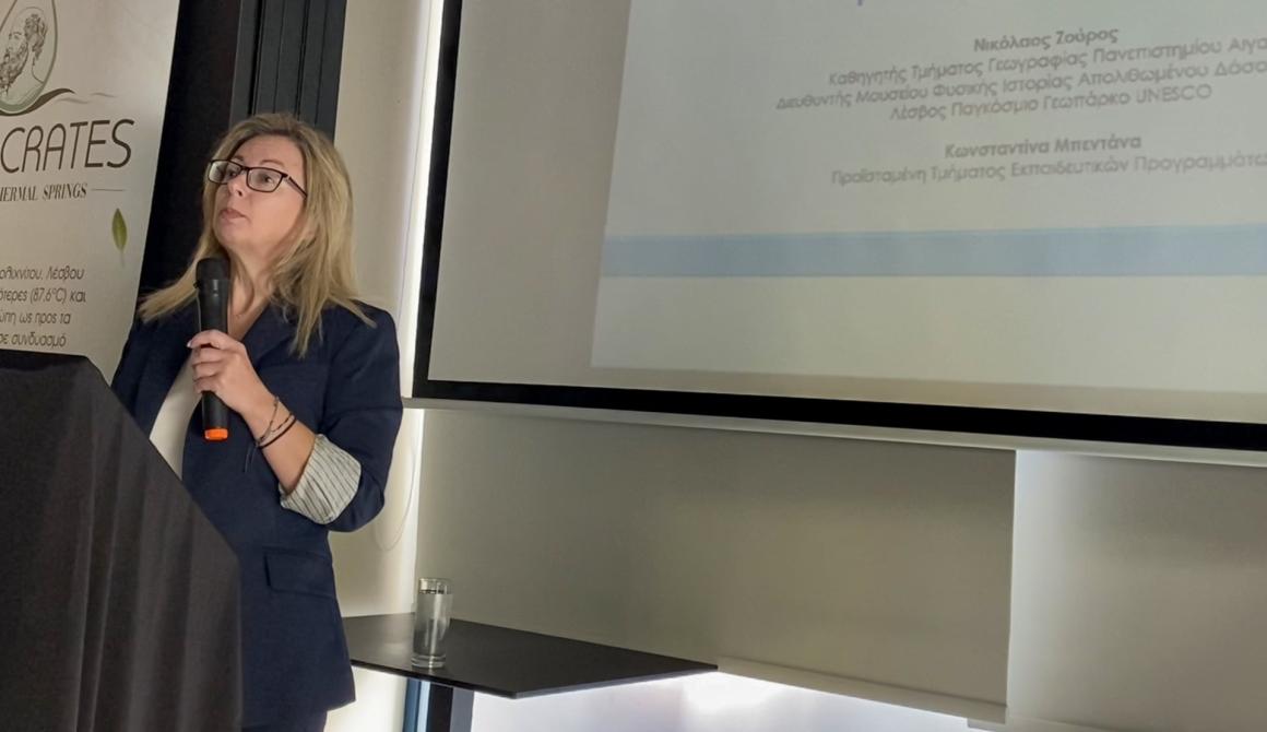 Η κ. Κωνσταντίνα Μπεντάνα, Προϊσταμένη του Τμήματος Εκπαιδευτικών Προγραμμάτων του Μουσείου και εκπρόσωπος του Γεωπάρκου Λέσβου, παρουσίασε τα εκπαιδευτικά προγράμματα και δράσεις που υλοποιούνται για μαθητές. Τόνισε ότι η Λέσβος, ως Παγκόσμιο Γεωπάρκο UNESCO, αποτελεί ιδανικό προορισμό για εκπαιδευτικές επισκέψεις και βιωματική μάθηση, προσφέροντας υπαίθριες τάξεις όπου οι μαθητές και οι εκπαιδευτικοί μπορούν να γνωρίσουν:
