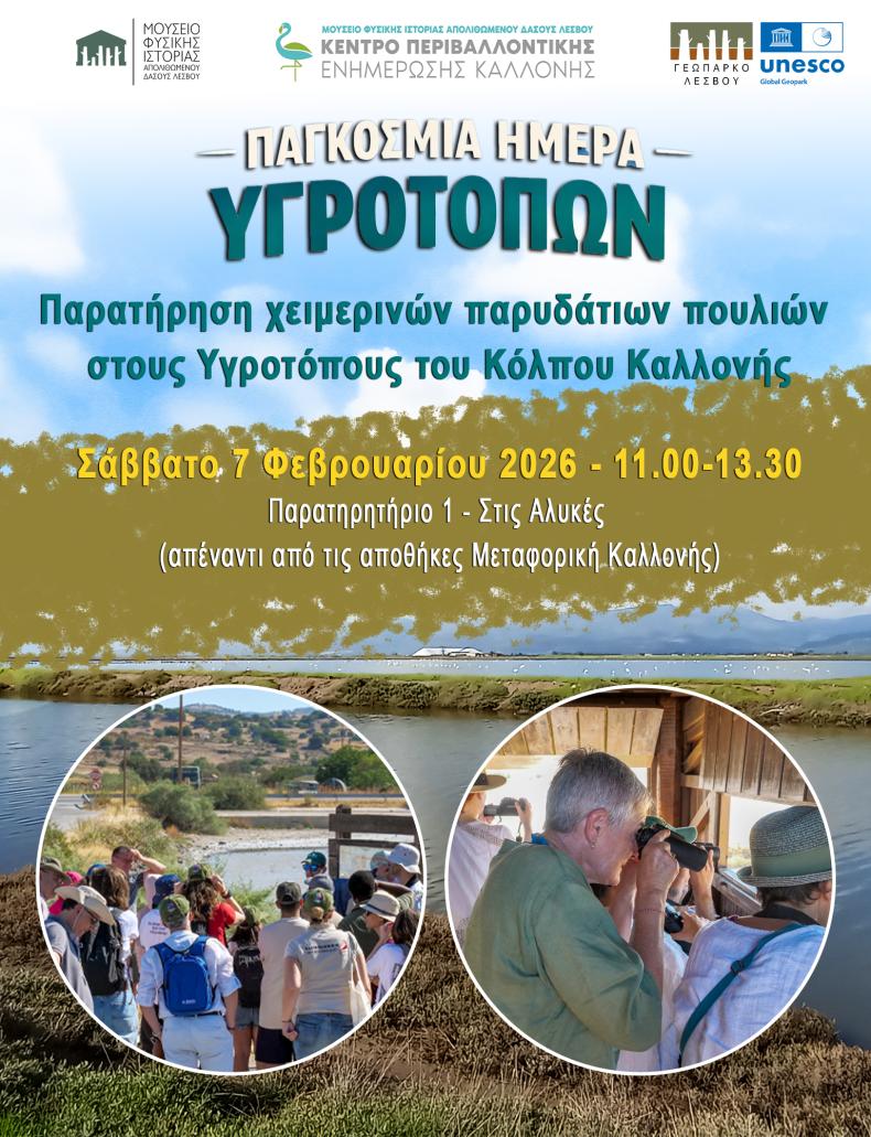 Τα στελέχη του Μουσείου Φυσικής Ιστορίας Απολιθωμένου Δάσους Λέσβου και του Κέντρου Περιβαλλοντικής Ενημέρωσης Καλλονής σας περιμένουν για την εκδήλωση ορνιθοπαρατήρησης που θα γίνει το Σάββατο 7 Φεβρουαρίου 2026 στις 11.00-13.30! Η εκδήλωση θα πραγματοποιηθεί στο Παρατηρητήριο Νο 1 στη ΒΑ πλευρά της Αλυκής (απέναντι από τη Μεταφορική Καλλονής).