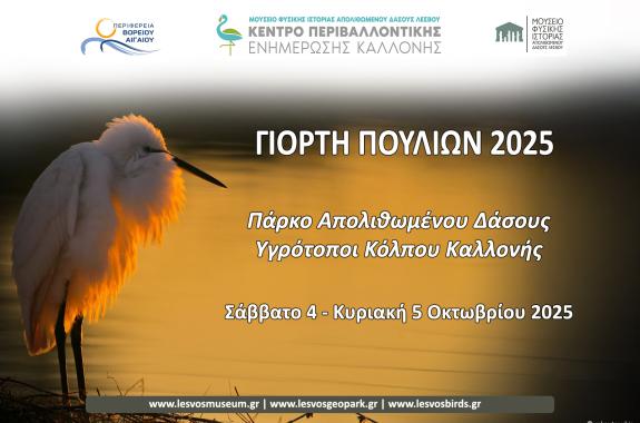 ΓΙΟΡΤΗ ΠΟΥΛΙΩΝ 2025 Γιορτάζουμε τη φθινοπωρινή μετανάστευση στο Απολιθωμένο Δάσος και στους Υγροτόπους Καλλονής! Σάββατο 4 - Κυριακή 5 Οκτωβρίου 2025 Το Μουσείο Φυσικής Ιστορίας Απολιθωμένου Δάσους Λέσβου και το Κέντρο Περιβαλλοντικής Ενημέρωσης Καλλονής προσκαλούν και φέτος φίλους και φίλες της...
