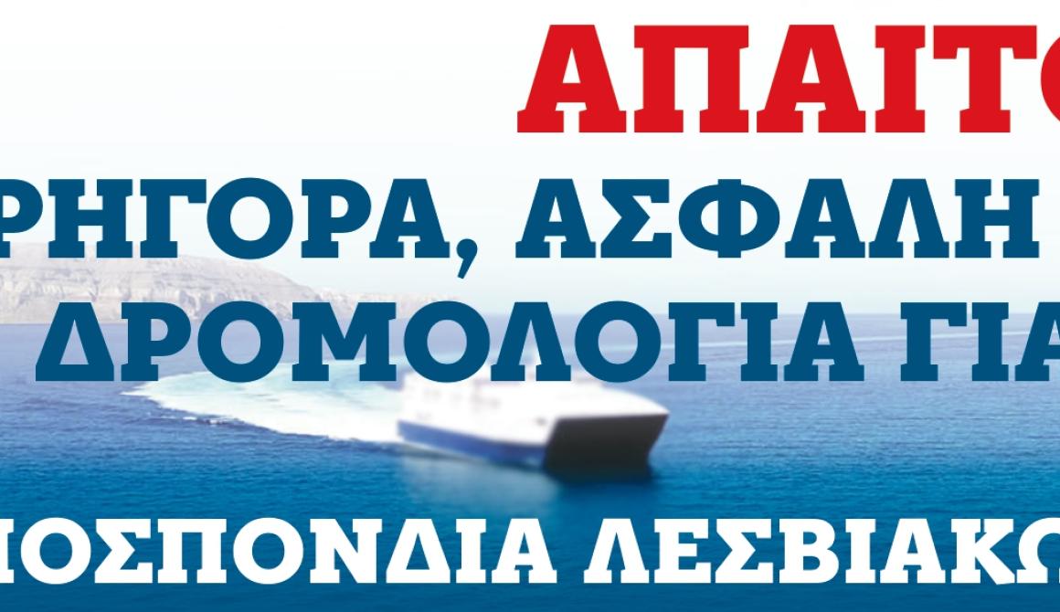 Με πρωτοβουλία των συντοπίτικων συλλόγων της Λέσβου στην Αθήνα καλούνται οι Λέσβιοι της Αθήνας να κατέβουν σε συγκέντρωση- κινητοποίηση, διεκδικώντας φθηνά ακτοπλοϊκά εισιτήρια, επάρκεια δρομολογίων για να καλύπτονται οι ανάγκες των νησιωτών και των ταξιδιωτών, ασφαλή για τους εργαζόμενους και τους επιβάτες και ταχύτερα από τα σημερινά των 12 έως και 14 ή 16 ωρών δρομολόγια.