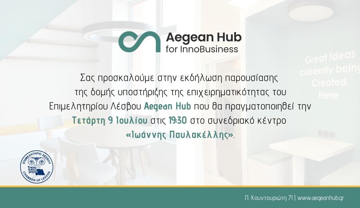 Το Επιμελητήριο Λέσβου σας προσκαλεί στην εκδήλωση παρουσίασης της Δομής Υποστήριξης Επιχειρηματικότητας «Aegean Hub», η οποία θα πραγματοποιηθεί την Τετάρτη 9 Ιουλίου 2025 και ώρα 19:30, στο Συνεδριακό Κέντρο «Ιωάννης Παυλακέλλης» στη Μυτιλήνη.