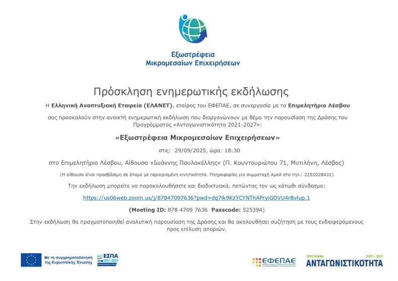 Το Επιμελητήριο Λέσβου και η Ελληνική Αναπτυξιακή Εταιρεία (ΕΛΑΝΕΤ), εταίρος του Ενδιάμεσου Φορέα Επιχειρησιακών Προγραμμάτων Ανταγωνιστικότητας και Επιχειρηματικότητας (ΕΦΕΠΑΕ), σας προσκαλούν σε ανοικτή ενημερωτική εκδήλωση την Δευτέρα 29 Σεπτεμβρίου 2025 και ώρα 18:30 με θέμα την παρουσίαση της νέας Δράσης του Επιχειρησιακού Προγράμματος «Ανταγωνιστικότητα 2021–2027»: «Εξωστρέφεια Μικρομεσαίων Επιχειρήσεων».