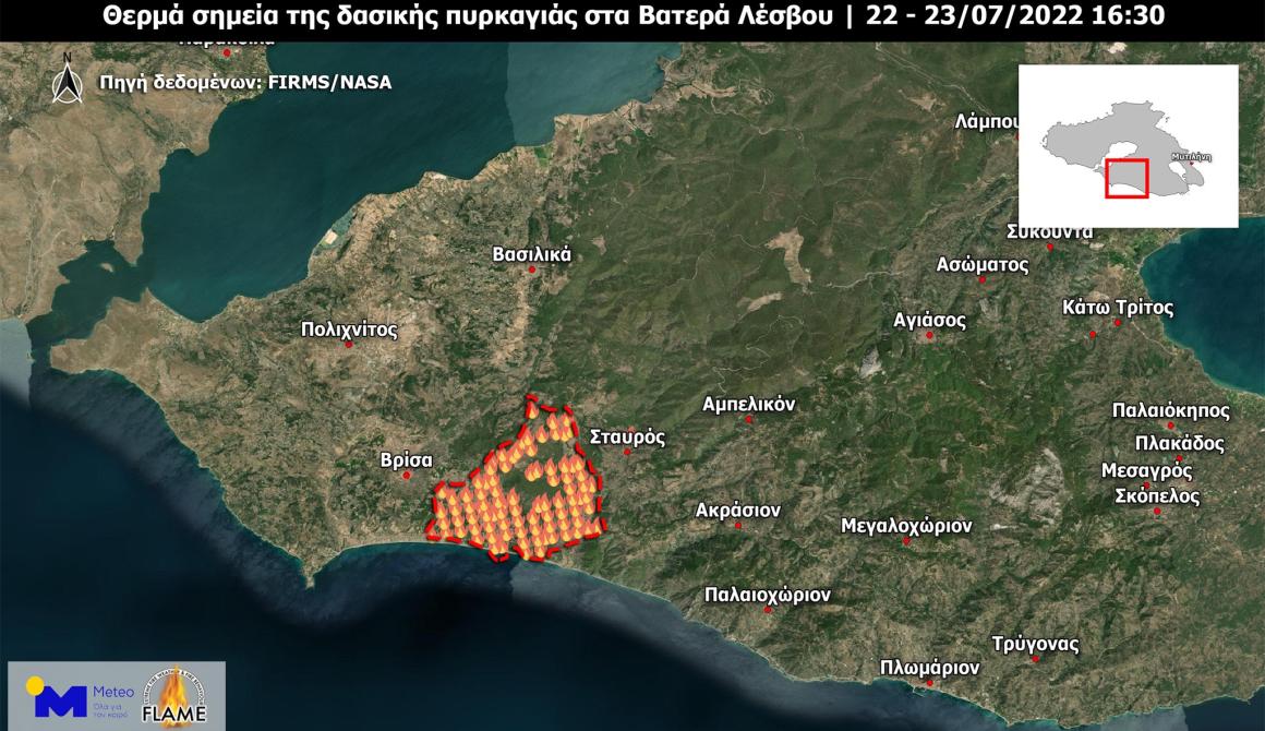 Δορυφορικές παρατηρήσεις από το σύστημα FIRMS (Fire Information for Resource Management System) της NASA δείχνουν τα θερμά σημεία που ανιχνεύθηκαν από δορυφόρους πολικής τροχιάς κατά τις μεσηβρινές ώρες (~14:00 τοπική ώρα) του Σαββάτου 23.07.2022 πάνω από την περιοχή των Βατερών στη Λέσβο (Εικόνα 1). Από την εξάπλωση των θερμών σημειών, προκύπτει ότι η φωτιά καθοδηγήθηκε από τους ΒΑ/ΑΒΑ ανέμους που έπνεαν στην περιοχή όταν αυτή εκδηλώθηκε.