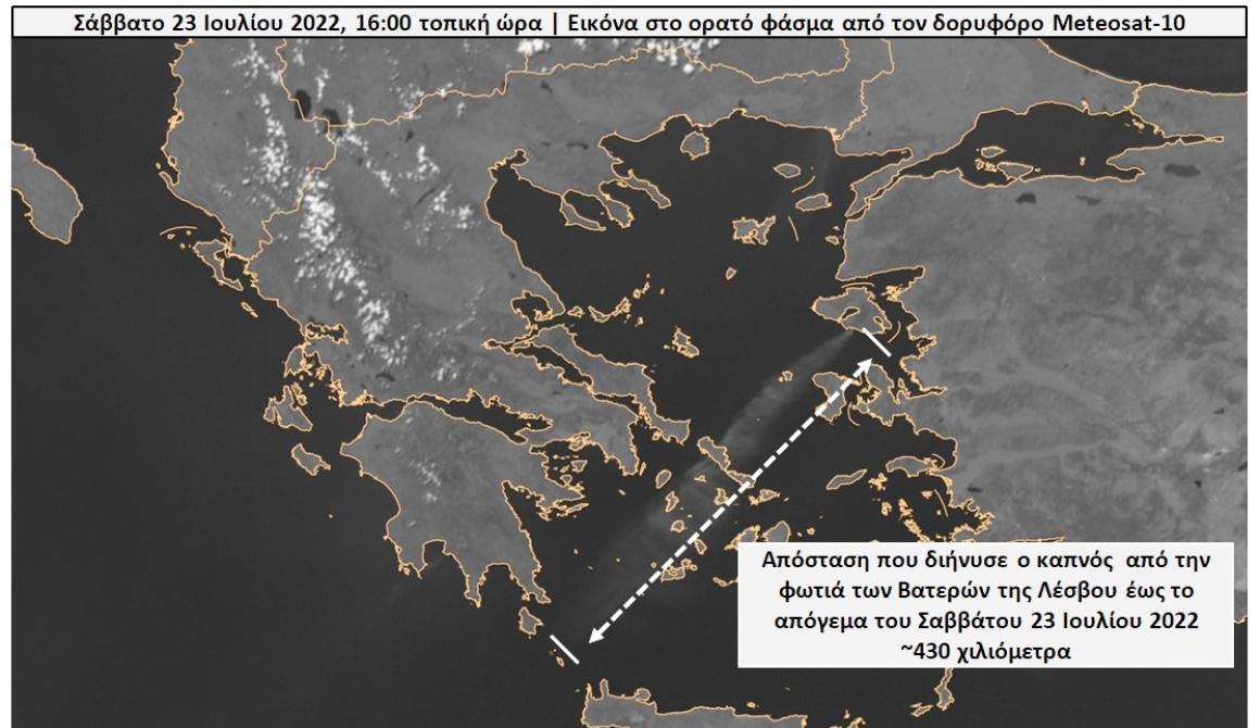 Σε οπτική δορυφορική εικόνα που ανέκτησε και επεξεργάστηκε η πυρομετεωρολογική ομάδα FLAME του Εθνικού Αστεροσκοπείου Αθηνών (ΕΑΑ) / meteo.gr από τον Ευρωπαϊκό δορυφόρο METEOSAT-10, φαίνεται ότι οι ΒΑ άνεμοι που πνέουν πάνω από το Αιγαίο έχουν μεταφέρει τον καπνό της φωτιάς έως και 430 km νοτιοδυτικά, πάνω από τα Κύθηρα (Εικόνα 2)