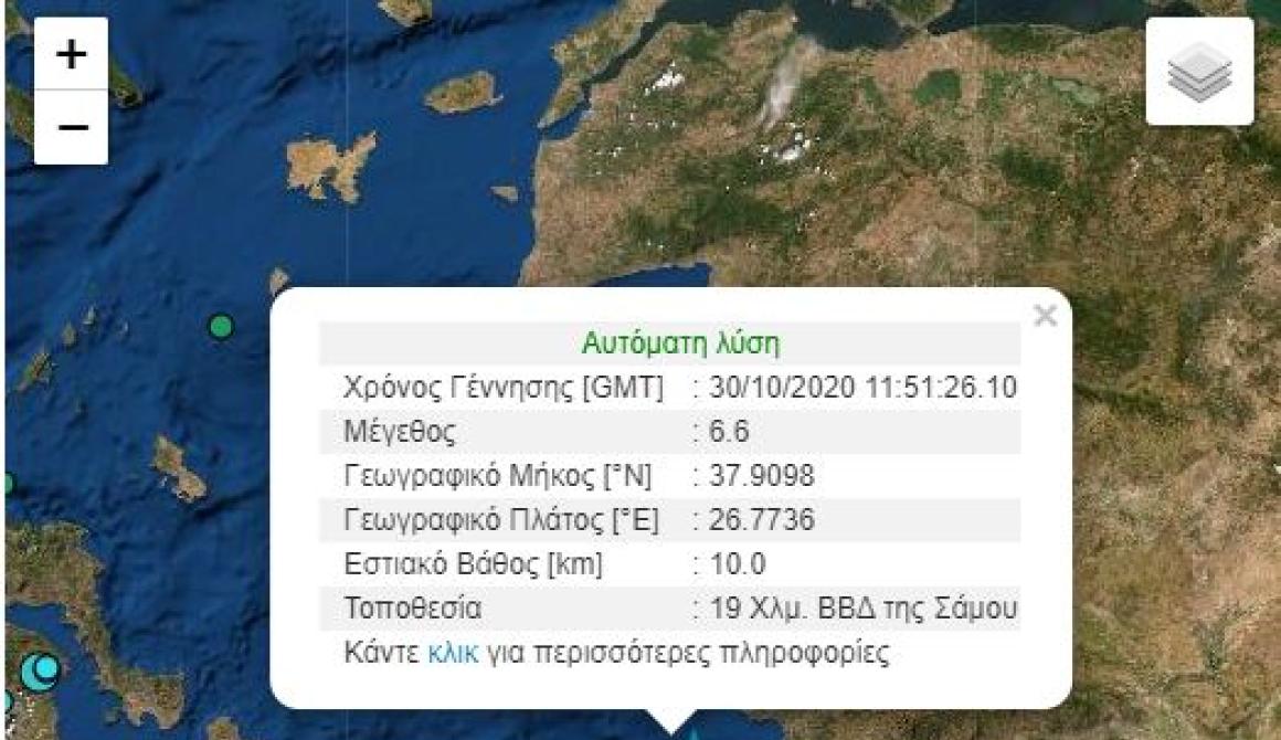 Συγκεκριμένα στις 13:51 σημειώθηκε σεισμική δόνηση μεγέθους 6,6 Ρίχτερ (σύμφωνα με την αυτόματη λύση του Γεωδυναμικού Ινστιτούτου) με επίκεντρο 19χλ Βόρειο Βορειοδυτικά της Σάμου. Ο σεισμός είχε εστιακό βάθος 10 χλμ.