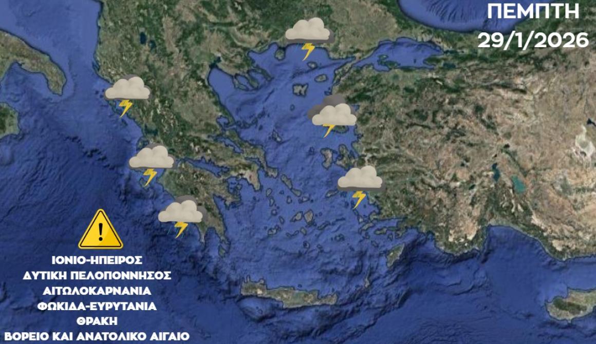 Ισχυρές βροχές και καταιγίδες καθώς και χαλαζοπτώσεις αναμένονται σήμερα, Πέμπτη (29/01), σε αρκετές περιοχές της χώρας λόγω της “κακοκαιρίας εξπρές” με την ονομασία “Kristin”.