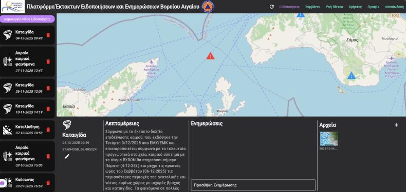 Η Πολιτική Προστασία της Περιφέρειας Βορείου Αιγαίου εξέδωσε αναλυτική ανακοίνωση για την κακοκαιρία “BYRON”, η οποία, σύμφωνα με το επικαιροποιημένο έκτακτο δελτίο της ΕΜΥ (3/12/2025), επηρεάζει από σήμερα Πέμπτη 4 Δεκεμβρίου έως και τις πρωινές ώρες του Σαββάτου 6 Δεκεμβρίου μεγάλο μέρος της χώρας, με ιδιαίτερα έντονα φαινόμενα στο Ανατολικό Αιγαίο.