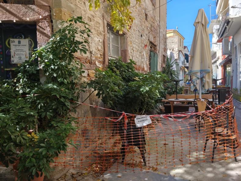 Στην καρδιά της Κουμιδιάς, εκεί όπου τα στενά γεμίζουν χρώμα από καφέ, μικρά μαγαζιά και το αρχιτεκτονικό αποτύπωμα μιας παλιάς Μυτιλήνης που επιμένει, ένα τρίστρατο παραμένει εδώ και εβδομάδες σφραγισμένο με κόκκινες κορδέλες. Η εικόνα δεν θυμίζει καθημερινότητα· θυμίζει σκηνικό εγκλήματος. Σαν κάποιος να ήθελε να κρατήσει μακριά τους περαστικούς για να μη χαθούν «στοιχεία».