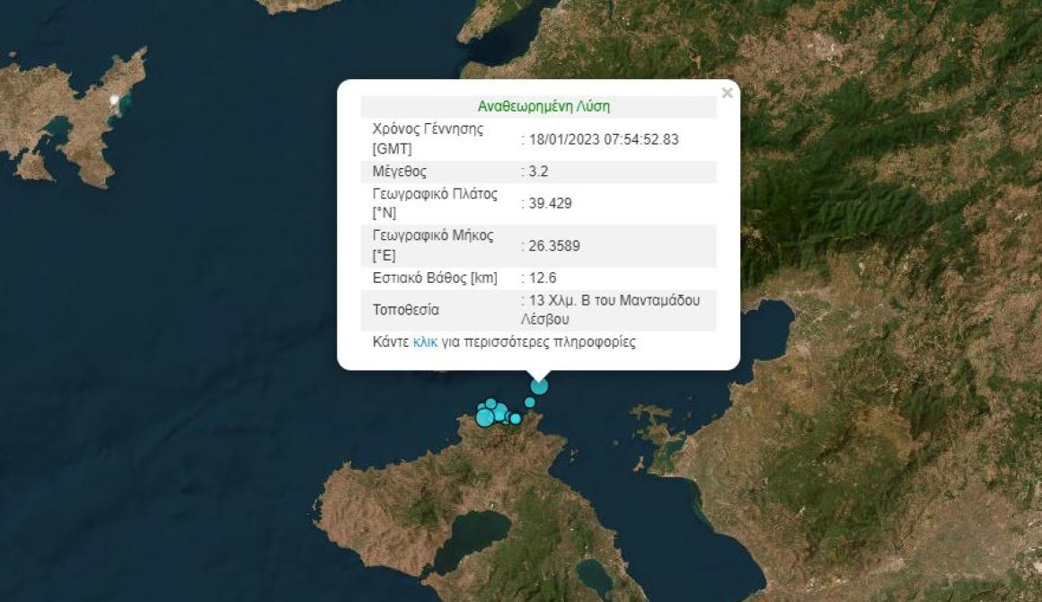 Σεισμική δόνηση μεγέθους 3,2 Ρίχτερ σημειώθηκε στις 09:54 το πρωί, 16 χιλιόμετρα βόρεια του Μανταμάδου στη Λέσβο.